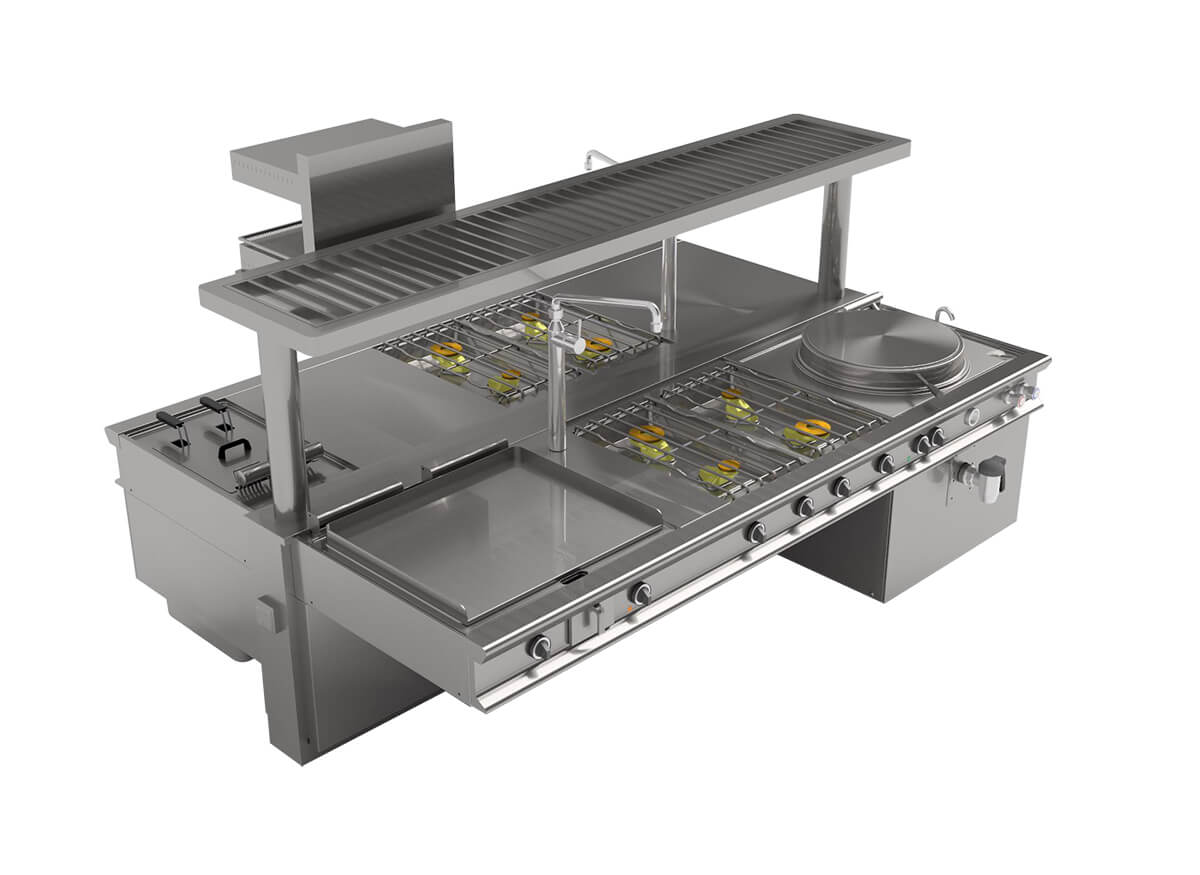 Every detail of the System 900 BF is designed with hygiene as a priority. Components are designed to minimize dirt, grease and grime, and make cleaning as quick and easy as possible. All corners have a wide surface areas, while burners and joints are completely waterproof. Cooking plates have a full working surface featuring a small cavity around the plate’s perimeter to drain fat and excess liquid. The lower base cupboards are fully welded as standard with no internal dirt-traps, screw heads or fixings (maximum hygiene level available – H3).