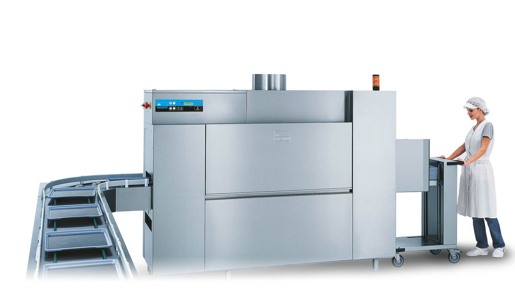The compact construction and the exceptional price/performance ratio enables individual design concepts to be introduced in virtually all wash-up areas. Trays no longer need to be picked-up and placed on the washing machine belt manually as they are automatically transferred from the tray transport conveyor into the tray washing machine, and deposited automatically onto the tray stacking trolley following the cleaning process. The result of this is shorter washing-up times, reduced working hours, less energy consumption, and therefore lower costs.