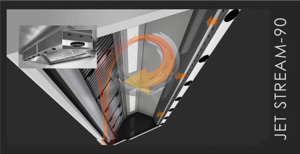 - Suitable for all types of cooking equipment whether wall mounted or in an island arrangement. The canopy features a double skin design which allows air to be delivered through slots arranged along the inner front face and if required inner sides of the canopy to effectively and efficiently contain the thermal plume and direct it towards the grease filters. Supply air is also discharged through the perforated front face of the canopy to ensure the ventilation system of the kitchen is correctly balanced.