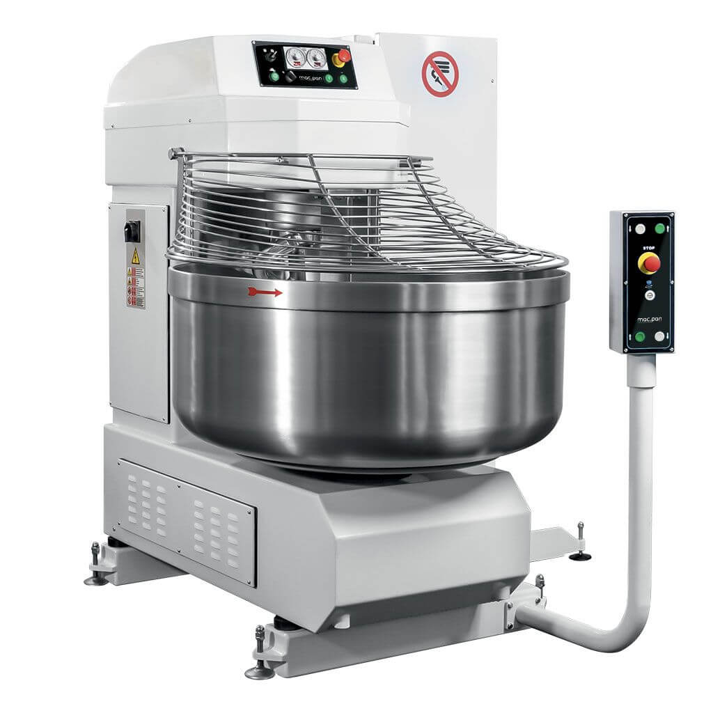 The body of the mixer is made of steel, the central tool, spiral arm and protective grid and bowl are all in stainless steel. This type of mixer is suitable for bakeries and cake shops and allows for shorter working times to be obtained. The work cycle can be manual or automatic with 2 speeds, both having programmable timers. It is also possible to change the rotation of bowl during the automatic cycle. Belt drivers eliminate vibration and noise: this system gives a considerable saving in maintenance costs. The low voltage electrical system (24 volts) has an automatic protection system with a very simple control panel for use in automatic or manual mode. The mixer complies with the latest CE regulations.