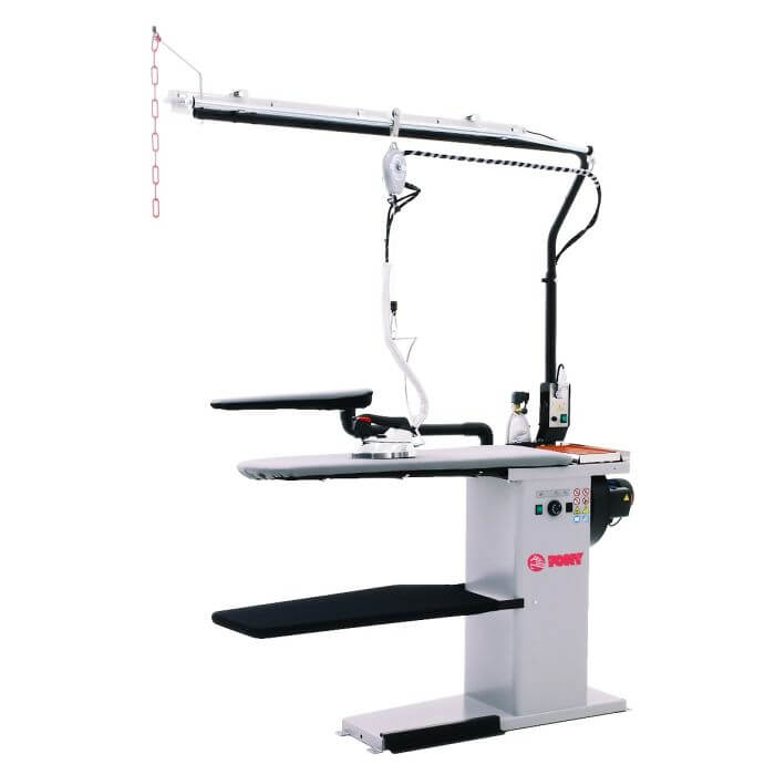 Upon request it can be supplied with pivoting arm with either sleeve-ironing shape or spotting shape, steam or cold spotting gun, water spray gun, lighting group with or without pully and support for iron.