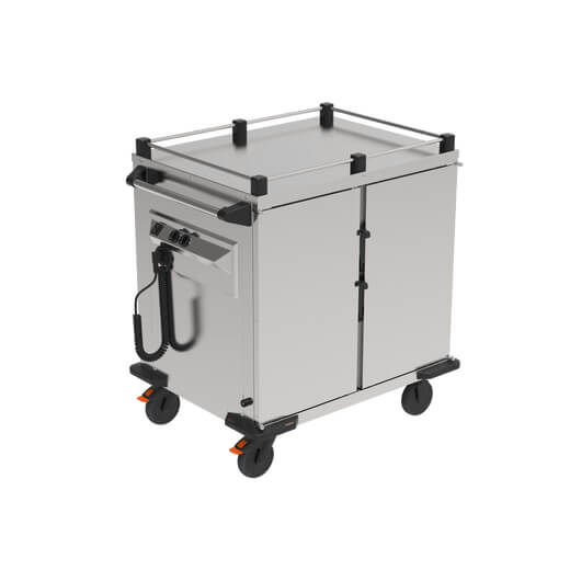 The robust food transport trolley, with a smooth worktop on top including an all-round gallery and with two separately controllable, electrically heated cupboard cabinets, at the bottom is used for the safe transport of food, for keeping food hot and cold and for serving food in a GN system. For the best food quality in food distribution.